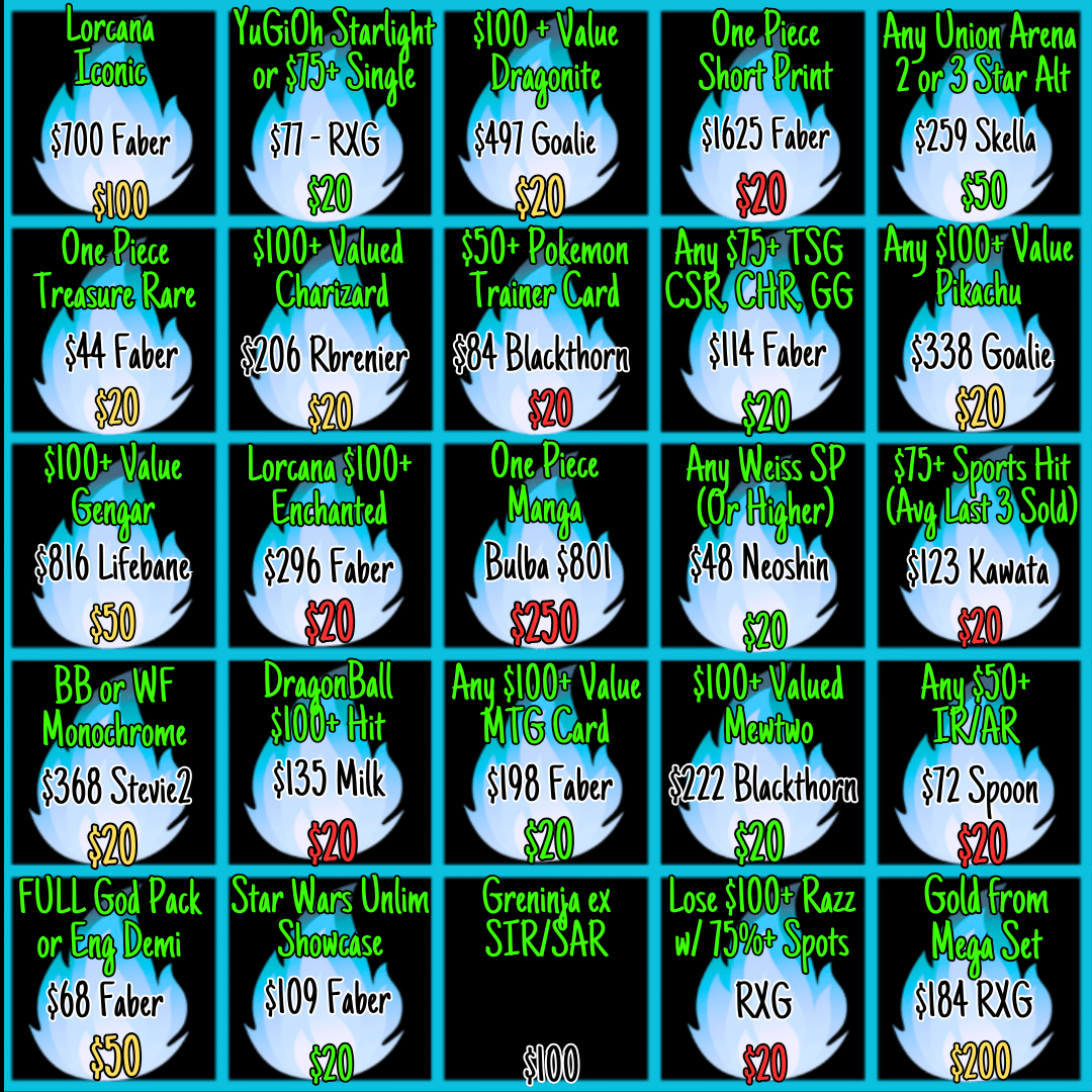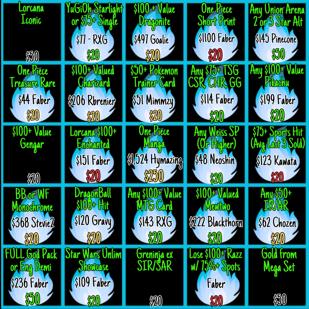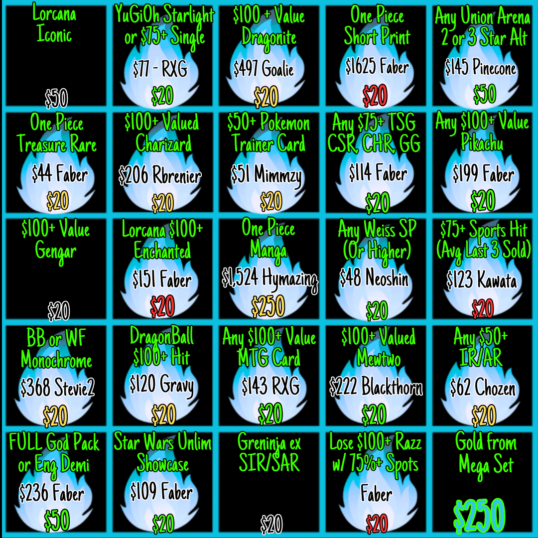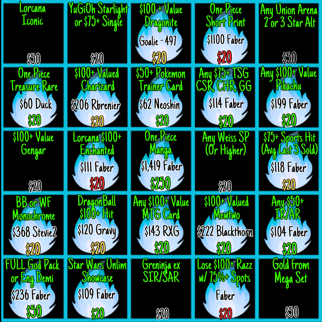 - Any market values will be determined by TCGplayer for english, Pricecharting for japanese, or the avg of last 3 sales on 130point for sports. *NEW* For any new sets that release, market value will not be determined until the Monday AFTER official release. Meaning that you may not hit a Bingo spot until that day, as values could be unfairly inflated pre-release.ย
